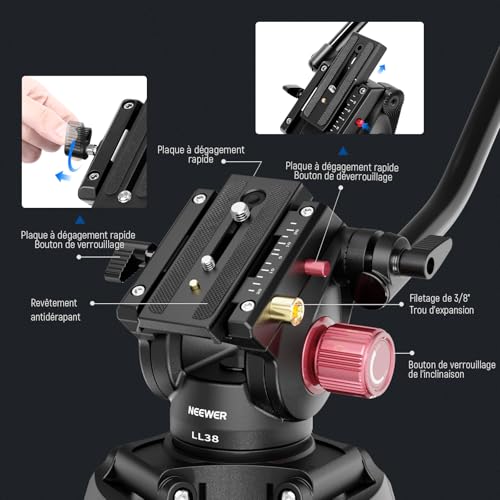NEEWER Trépied pour appareil photo vidéo 2 m avec tête fluide, trépied haute performance en aluminium avec fermeture rapide et plaque QR compatible avec caméscope Canon Nikon Sony DSLR Charge maximale